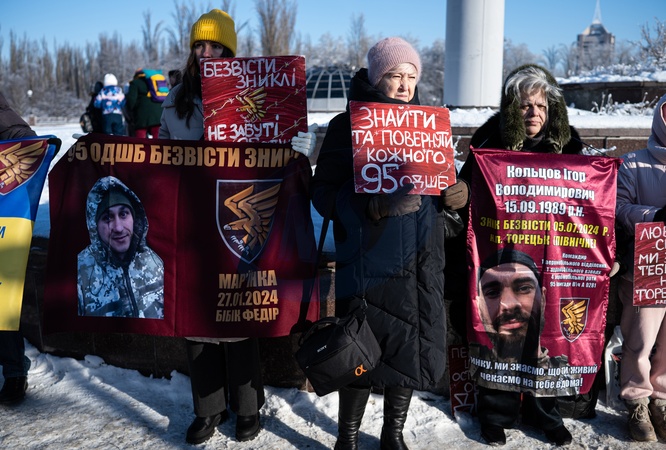 Activists hold banners and placards during a weekly reminder rally in support of prisoners of war from the Mariupol garrison, all prisoners of war and missing defenders of Ukraine, titled "Don't Be Silent! Captivity Kills,” held outside the Dorohozhychi metro station, Kyiv, Ukraine, on January 18, 2026, Credit:Danylo Antoniuk / Avalon