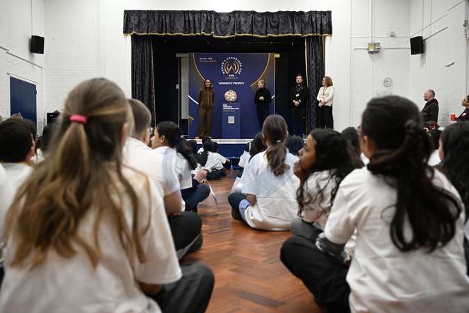 BRENTFORD, ENGLAND - JANUARY 19: Alex Scott and Jill Ellis talk to the pupils during the FIFA Women's Champions Cup Trophy reveal at Lionel Primary School on January 19, 2026 in Brentford, England. *** Local Caption ***, Credit:TJ / TJ / Avalon