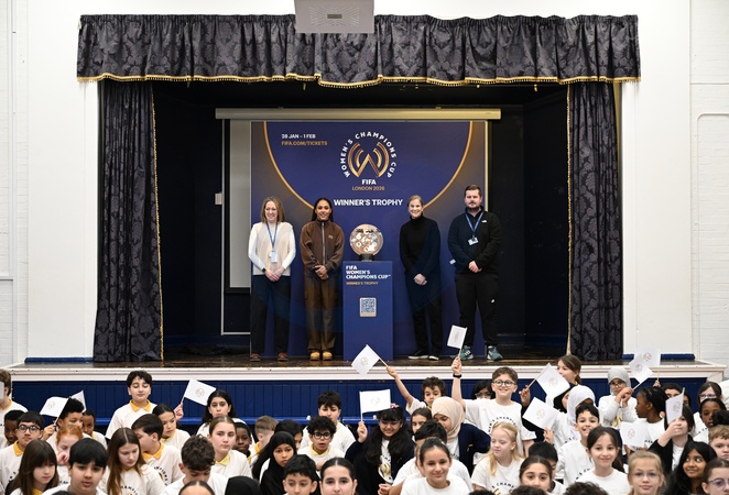 BRENTFORD, ENGLAND - JANUARY 19: Alex Scott and Jill Ellis pose with the trophy and pupils during the FIFA Women's Champions Cup Trophy reveal at Lionel Primary School on January 19, 2026 in Brentford, England. *** Local Caption ***, Credit:TJ / XX / Avalon