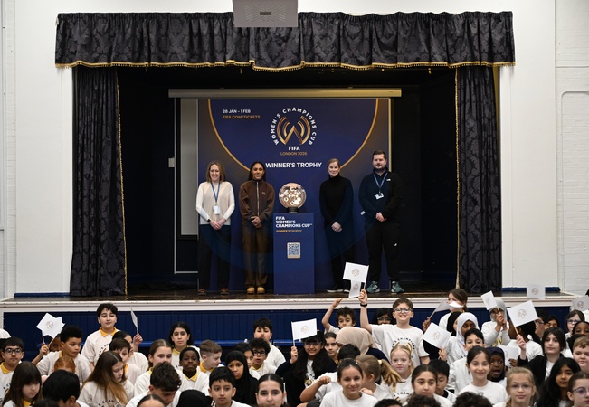 BRENTFORD, ENGLAND - JANUARY 19: Alex Scott and Jill Ellis pose with the trophy and pupils during the FIFA Women's Champions Cup Trophy reveal at Lionel Primary School on January 19, 2026 in Brentford, England. *** Local Caption ***, Credit:TJ / XX / Avalon