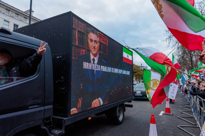 Iranian Embassy, London, UK. 18th January 2026.An LED Digi van showing images and videos of Crown Prince Reza Pahlavi joins a convoy of cars, many draped with the historic Imperial 'Lions and Sun' flag of Iran, roar past the Iranian Embassy in London.Thousands of Iranians continue to gather in front of the Embassy in solidarity with the activist in Iran, calling for the end of the Islamic regime and return of the Pahlavi Monarchy, Credit:Photo by Amanda Rose / Avalon