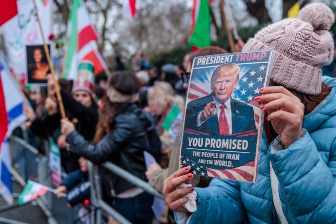 Iranian Embassy, London, UK. 18th January 2026.A protester holds a sign 'President Trump, You Promised to Help Iranians and the World' in reference to the US President promising to support Iranians as they fill the streets in Iran calling for an end to the Islamic regime and return of the Pahlavi Monarchy.Thousands of Iranians continue to gather in front of the Iranian Embassy in London, in solidarity with the Iranian activists., Credit:Photo by Amanda Rose / Avalon