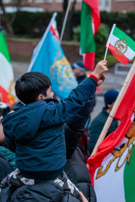 Iranian Embassy, London, UK. 18th January 2026.A young child, sitting on his fathers shoulders, waves the historic Imperial 'Lion and Sun' flag of Iran.Thousands of Iranians continue to gather in front of the Embassy of the Islamic Republic of Iran, in protest of the reported violence, mass killings and arrests of the protesters in Iran and show support for the return of Crown Prince Reza Pahlavi., Credit:Photo by Amanda Rose / Avalon