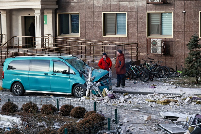 Men stand by a car damaged as a result of a Russian unmanned aerial vehicle attack on the premises of a 25-storey residential building in Odesa, Ukraine, on January 19, 2026, Credit:Nina Liashonok / Avalon