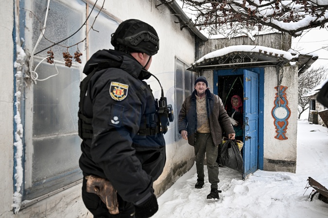 Police evacuate a family that agreed to relocate to a safer area from a frontline settlement near Huliaipole, Zaporizhzhia region, on January 16, 2026. With the front line close and the security situation extremely dangerous, police deliver humanitarian aid, assist people living alone with basic supplies, evacuate residents, and care for abandoned animals in depopulated villages, Credit:Dmytro Smolienko / Avalon