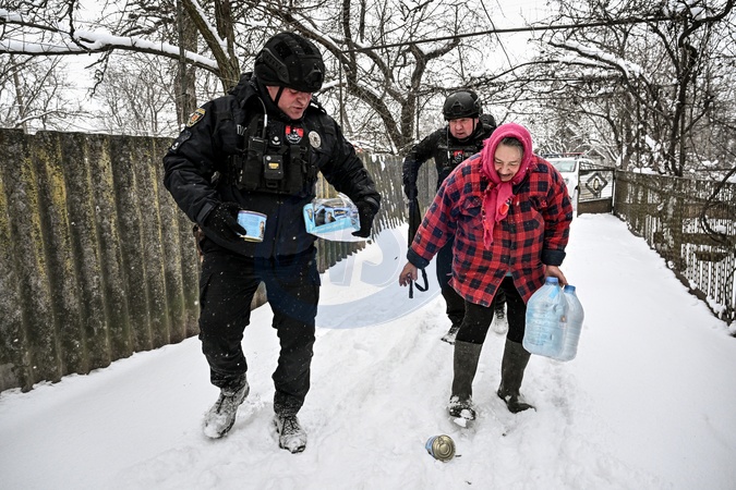 Police officers deliver food supplies and hygiene items to civilians in one of the frontline settlements near Huliaipole, Zaporizhzhia region, on January 16, 2026. Because of constant shelling threats and the closeness of the front line, only police are able to deliver humanitarian aid in the area. Officers also evacuate residents to safer locations and provide food and water to those living alone, as well as feed abandoned animals in empty villages, Credit:Dmytro Smolienko / Avalon