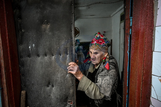 An elderly woman opens the door as police officers come to speak with her about evacuation to a safer location in a frontline settlement near Huliaipole, Zaporizhzhia region, on January 16, 2026. In the area, only police are able to deliver humanitarian aid because of extreme danger and the closeness of hostilities, while also supplying bread and water, evacuating civilians, and feeding abandoned animals in empty villages, Credit:Dmytro Smolienko / Avalon