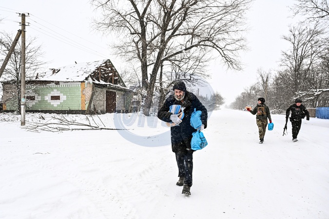 A man carries a food package delivered by police officers during a humanitarian mission in one of the frontline settlements near Huliaipole, Zaporizhzhia region, on January 16, 2026. Due to deadly risks and the proximity of the front line, police are solely responsible for humanitarian assistance in the area, including food deliveries, evacuations, and feeding abandoned animals during patrols in deserted villages, Credit:Dmytro Smolienko / Avalon