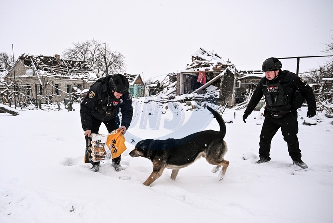 Police officers feed dogs during a humanitarian mission in one of the frontline settlements near Huliaipole, Zaporizhzhia region, on January 16, 2026. Due to deadly danger and the proximity of the front line in the Huliaipole area, humanitarian aid to civilians is delivered exclusively by police. Officers also bring bread and water to people living alone, evacuate residents to safer locations, and feed abandoned animals during patrols in deserted villages, Credit:Dmytro Smolienko / Avalon