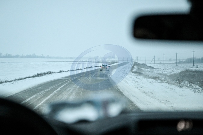 A police patrol travels to frontline villages in the Huliaipole area as part of a humanitarian mission, Zaporizhzhia region, on January 16, 2026. Due to deadly risks and the proximity of the front line, police are solely responsible for delivering humanitarian aid, evacuating residents, supporting people living alone, and feeding abandoned dogs and cats in deserted villages, Credit:Dmytro Smolienko / Avalon