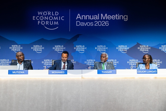 Africa's Job Engine session with Ahmed Shide Mohamed, Minister of Finance of Ethiopia; Angela Oduor Lungati, Executive Director, Ushahidi, Kenya; Godfrey Mutizwa, Chief Editor, CNBC Africa, South Africa; Yusuf Maitama Tuggar, Minister of Foreign Affairs of Nigeria; at the World Economic Forum Annual Meeting 2026 in Davos-Klosters, Switzerland, on 20/1/2026 from 09:30 to 10:00 in the Kurpark Village – Briefing Centre (Zone K), Issue Briefing. (issue briefing/jobs africa). Copyright: Ciaran McCrickard / World Economic Forum, Credit:World Economic Forum / Avalon