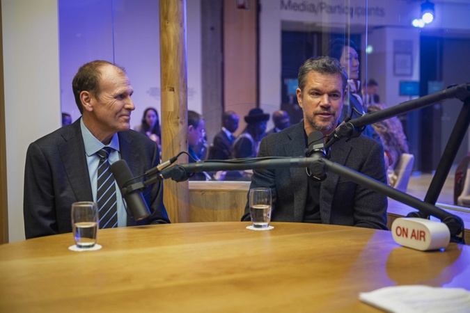 Davos on Air: Rethinking with Adam Grant session with Adam Grant, Saul P. Steinberg Professor of Management and Psychology, Wharton School, University of Pennsylvania, USA; Gary White, Co-Founder and Chief Executive Officer, Water.org, USA; Matt Damon, Co-Founder, Water.org, USA; at the World Economic Forum Annual Meeting 2026 in Davos-Klosters, Switzerland, on 20/1/2026 from 12:30 to 13:15 in the Congress Centre – Davos On Air (Zone C), Podcast. (podcast/thinking 2). 2026 World Economic Forum, Credit:AMIT LAVEE/World Economic Forum / Avalon