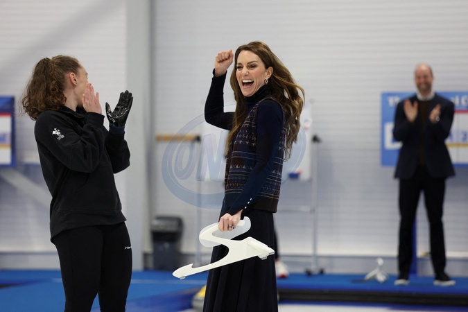 Britain's Kate, Princess of Wales reacts next to Scottish curler Jen Dodds while participating in curling as she meets with the Team GB and Paralympics GB Curling teams ahead of the Winter Olympic Games at the National Curling Academy in Stirling, Scotland, Britain, January 20, 2026., Credit:Russell Cheyne / Avalon