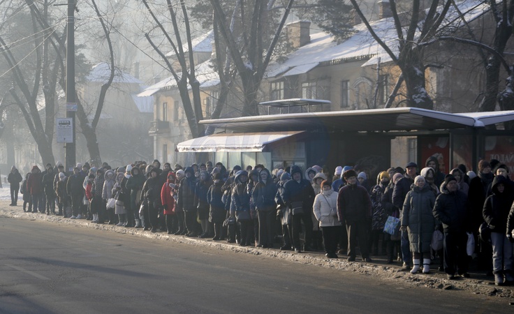 People stand in line at a public transport stop near the Chernihivska metro station, Kyiv, Ukraine, on January 20, 2026. Due to disruptions in electric public transport, large queues formed at bus and minibus stops on the Left Bank of the city, Credit:Yuliia Ovsiannikova / Avalon