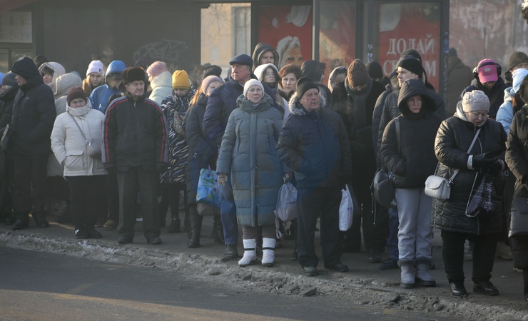 People stand in line at a public transport stop near the Chernihivska metro station, Kyiv, Ukraine, on January 20, 2026. Due to disruptions in electric public transport, large queues formed at bus and minibus stops on the Left Bank of the city, Credit:Yuliia Ovsiannikova / Avalon