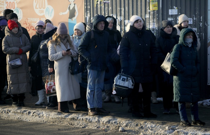 People stand in line at a public transport stop near the Chernihivska metro station, Kyiv, Ukraine, on January 20, 2026. Due to disruptions in electric public transport, large queues formed at bus and minibus stops on the Left Bank of the city, Credit:Yuliia Ovsiannikova / Avalon