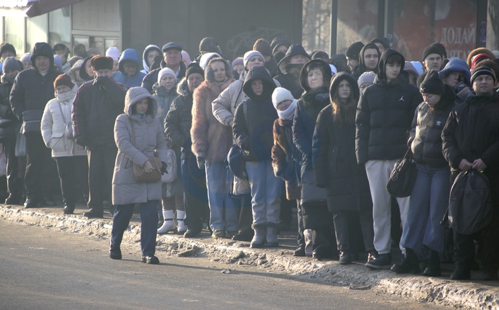 People stand in line at a public transport stop near the Chernihivska metro station, Kyiv, Ukraine, on January 20, 2026. Due to disruptions in electric public transport, large queues formed at bus and minibus stops on the Left Bank of the city, Credit:Yuliia Ovsiannikova / Avalon