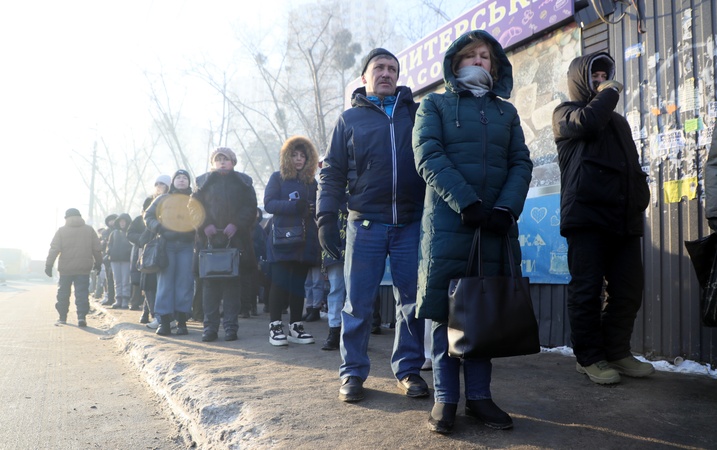 People stand in line at a public transport stop near the Chernihivska metro station, Kyiv, Ukraine, on January 20, 2026. Due to disruptions in electric public transport, large queues formed at bus and minibus stops on the Left Bank of the city, Credit:Yuliia Ovsiannikova / Avalon