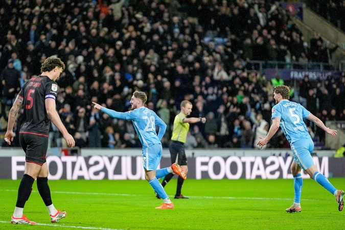 Josh Eccles of Coventry City celebrates his team's goal to make it 1-0 as the Referee Andrew Kitchen looks at his goal line decision system to award the goal during the Sky Bet Championship match Coventry City vs Millwall at Coventry Building Society Arena, Coventry, United Kingdom, 20th January 2026, Credit:Maynard Manyowa/News Images / Avalon