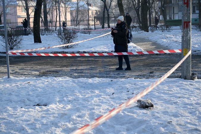 A woman stands by the impact site of falling debris from a Russian strike drone in the Dniprovskyi district of Kyiv, Ukraine, on January 20, 2026. The massive Russian missile and drone attack damaged non-residential buildings, cut power to water supply infrastructure facilities, and left 5,635 multi-storey residential buildings without heating, Credit:Yevhen Kotenko / Avalon