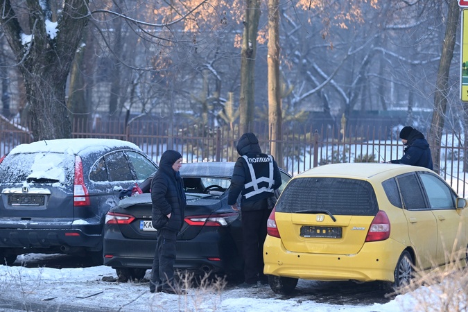 Men and a police officer stand next to the cars damaged by debris from a Russian strike drone in the Dniprovskyi district of Kyiv, Ukraine, on January 20, 2026. The massive Russian missile and drone attack damaged non-residential buildings, cut power to water supply infrastructure facilities, and left 5,635 multi-storey residential buildings without heating, Credit:Yevhen Kotenko / Avalon