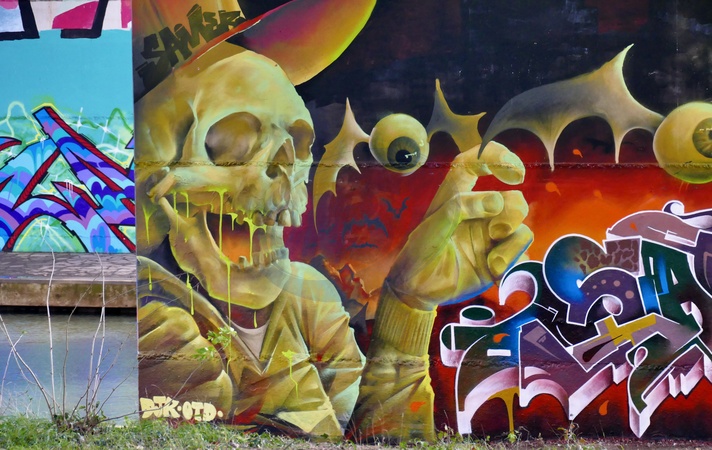 The recent colourful artworks on the underside of the viaduct. The Loddon Viaduct is a place where graffiti artists come to display their talents, with ever changing artworks on the underpass to brighten up commuters and walkers days with the vibrant displays, one often being covered by another within days. The work can be seen from the River Thames, the link road and the showcase cinema complex., Credit:Geoffrey Swaine / Avalon
