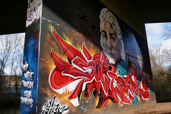 The recent colourful artworks on the underside of the viaduct. The Loddon Viaduct is a place where graffiti artists come to display their talents, with ever changing artworks on the underpass to brighten up commuters and walkers days with the vibrant displays, one often being covered by another within days. The work can be seen from the River Thames, the link road and the showcase cinema complex., Credit:Geoffrey Swaine / Avalon