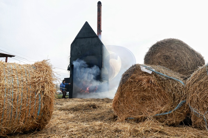 A boiler and bales of straw used for heating are seen on the premises of a school in the Marazliivka territorial community, Odesa region, Ukraine, on January 19, 2026. Due to prolonged electricity outages and heating disruptions resulting from Russian missile and drone attacks on Ukraine's energy infrastructure, schools in the region are switching to straw heating, Credit:Nina Liashonok / Avalon