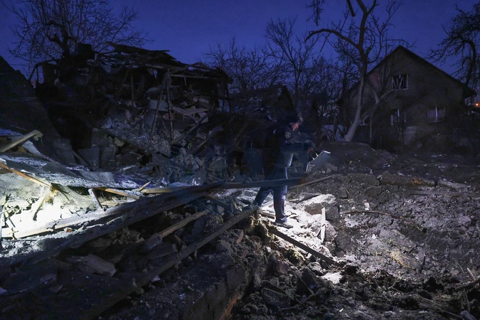 An officer of the National Police of Ukraine shines a flashlight on a crater formed as a result of a Russian guided aerial bomb strike in a private residential area of the Slobidskyi district of Kharkiv, Ukraine, on January 19, 2026, Credit:Viacheslav Madiievskyi / Avalon