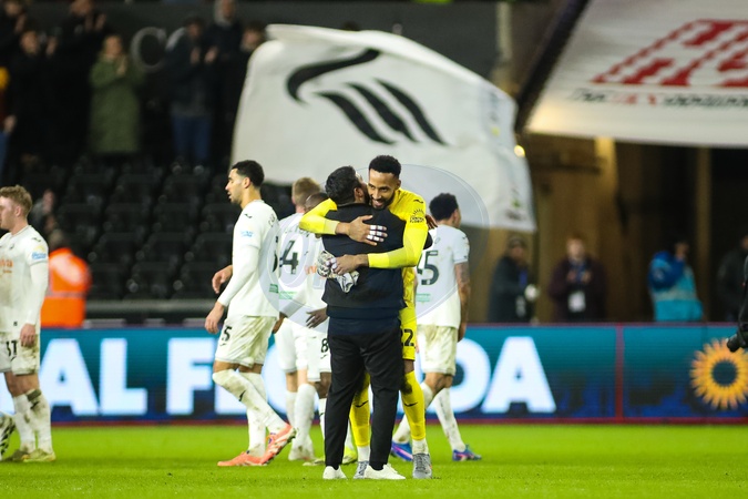 Swansea City Head Coach Vitor Matos embraces Swansea City goalkeeper Lawrence Vigouroux at the final whistle during the Sky Bet Championship match Swansea City vs Blackburn Rovers at Swansea.com Stadium, Swansea, United Kingdom, 20th January 2026, Credit:Andrew Lewis/News Images / Avalon