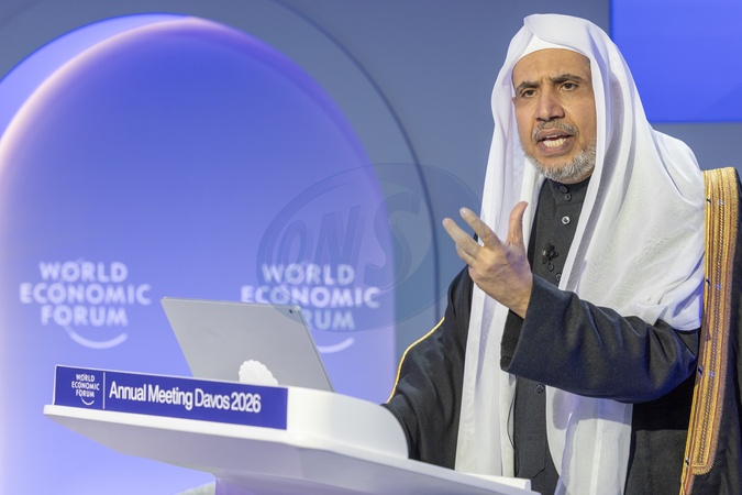Advancing Interfaith Dialogue for Peace session with Mohammed Al-Issa, Secretary-General, Muslim World League (MWL), Saudi Arabia; Pinchas Goldschmidt, Chief Rabbi and President, Conference of European Rabbis; at the World Economic Forum Annual Meeting 2026 in Davos-Klosters, Switzerland, on 21 January 2026 from 09:00 to 09:30 in the Congress Centre – Spotlight (Zone B), Issue Briefing., Credit:Benedikt von Loebell / Avalon