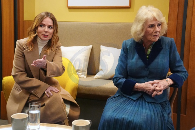 Queen Camilla, President of Maggie's, and former Spice Girl Geri Halliwell-Horner sharing a cup of tea with people living with cancer as she hears about their experiences being supported by Maggie's Cheltenham, during a visit to the charity's centre in Cheltenham, Gloucestershire, as they mark the 30th anniversary of the first Maggie's centre opening. Picture date: Wednesday January 21, 2026., Credit:Jacob King / Avalon