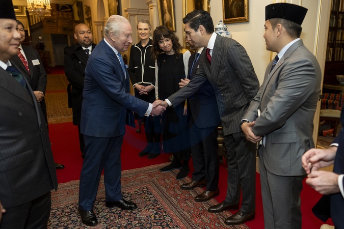 King Charles III and President of Indonesia Prabowo Subianto greet Member of the People's Representative Council of the Republic of Indonesia, Budi Djiwandono after an audience at Clarence House in London. Picture date: Wednesday January 21, 2026., Credit:Aaron Chown / Avalon