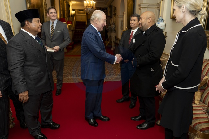 King Charles III and President of Indonesia Prabowo Subianto greet Ragowo Hediprasetyo, Son of the Indonesian President after an audience at Clarence House in London. Picture date: Wednesday January 21, 2026., Credit:Aaron Chown / Avalon
