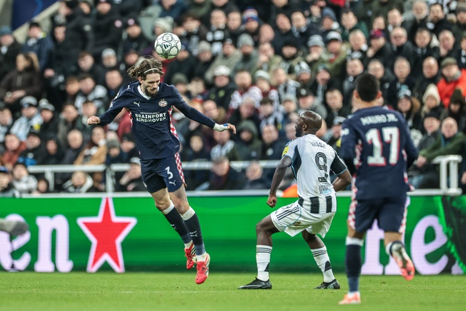 Yarek Gasiorowski of PSV Eindhoven jumps up to win the high ball during the UEFA Champions League Matchday 7 of 8 Newcastle United v PSV Eindhovenn at St. James's Park, Newcastle, United Kingdom, 21st January 2026, Credit:Mark Cosgrove/News Images / Avalon