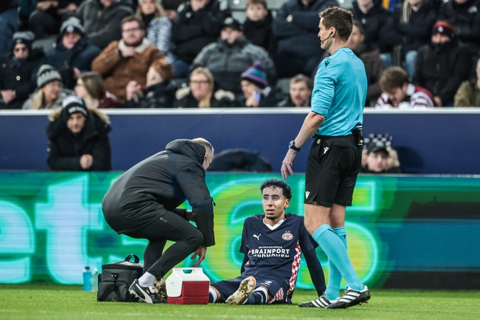 Anass Salah-Eddine of PSV Eindhoven is treated for an injury during the UEFA Champions League Matchday 7 of 8 Newcastle United v PSV Eindhovenn at St. James's Park, Newcastle, United Kingdom, 21st January 2026, Credit:Mark Cosgrove/News Images / Avalon