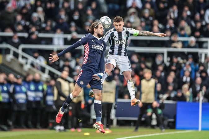 Kieran Trippier of Newcastle Untied jumps up to win the high ball during the UEFA Champions League Matchday 7 of 8 Newcastle United v PSV Eindhovenn at St. James's Park, Newcastle, United Kingdom, 21st January 2026, Credit:Mark Cosgrove/News Images / Avalon