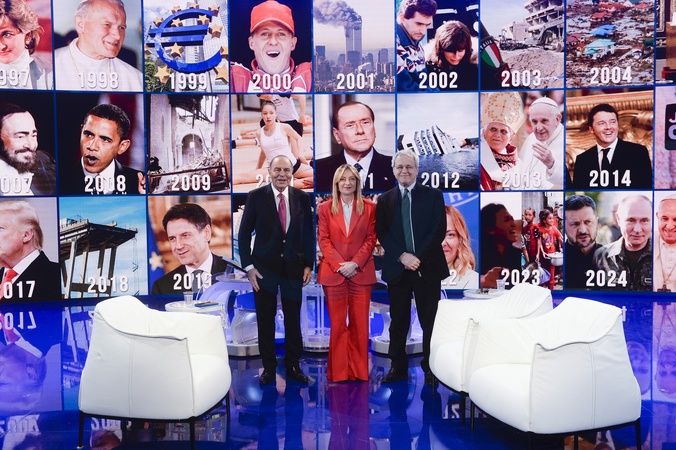 Italy, Rome, 21 January, 2026 : The President of the Council Giorgia Meloni, participates at the special episode 30 years of TV talk show 'Porta a Porta' (Door to Door). In photo Giorgia Meloni with journalists (L) Bruno Vespa and (R) Enrico Mentana, Credit:Stefano Carofei / Avalon