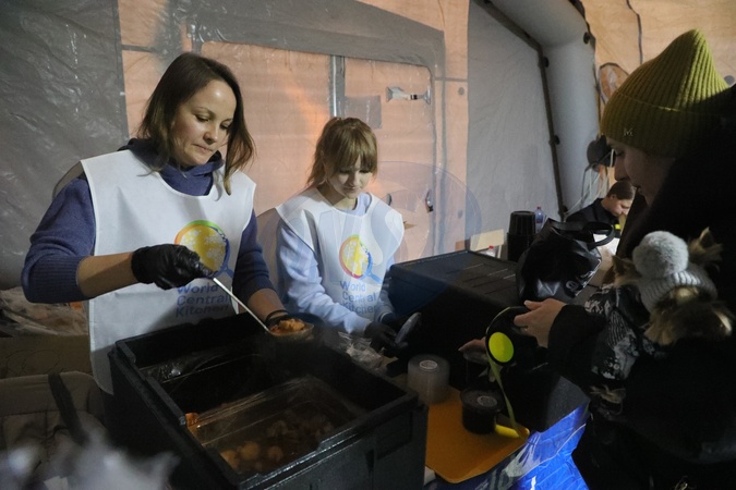 Volunteers serve free hot meals to residents at a mobile heating point operated by the State Emergency Service of Ukraine in the Voskresenka district of Kyiv, Ukraine, on January 21, 2026, Credit:Yuliia Ovsiannikova / Avalon