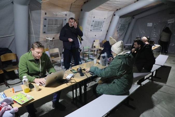 Residents work and charge their gadgets at a mobile heating point of the State Emergency Service of Ukraine deployed in the Voskresenka residential area, Kyiv, Ukraine, on January 21, 2026, Credit:Yuliia Ovsiannikova / Avalon