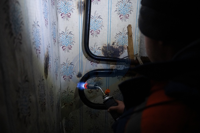 Repair workers of Ukrzaliznytsia help municipal services thaw frozen pipes in a residential building in Kyiv's Holosiivskyi district, Kyiv, Ukraine, on January 21, 2026. Following Russian attacks on energy infrastructure, around 3,000 apartment buildings in the capital remain without heat. Emergency power cuts are ongoing as utility and energy workers work nonstop to restore heating and electricity, Credit:Danylo Antoniuk / Avalon