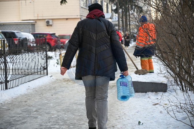 A woman carries empty bottles as she walks toward a filtered drinking water sales point in Kyiv, Ukraine, on January 21, 2026. Russian shelling and power cuts at Kyivvodokanal facilities overnight on January 20 left almost the entire left bank of the city without water, Credit:Yevhen Kotenko / Avalon
