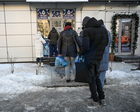 Residents of the Rusanivka neighborhood stand in line at a kiosk selling filtered drinking water in Kyiv, Ukraine, on January 21, 2026. Russian shelling and power cuts at Kyivvodokanal facilities overnight on January 20 left almost the entire left bank of the city without water, Credit:Yevhen Kotenko / Avalon