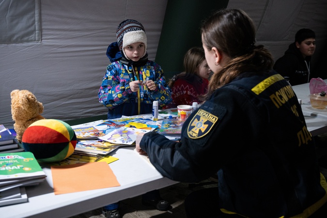 A psychologist of the State Emergency Service of Ukraine talks with a child at a mobile heating point of the State Emergency Service of Ukraine deployed in the Troieshchyna residential area amid power and heating disruptions following Russian attacks on Ukraine's energy facilities, Kyiv, Ukraine, on January 21, 2026, Credit:Danylo Antoniuk / Avalon