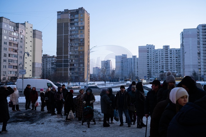 People stand in line for free hot meals provided by the charity organization World Central Kitchen outside a mobile heating point of the State Emergency Service of Ukraine deployed in the Troieshchyna residential area amid power and heating disruptions following Russian attacks on Ukraine's energy facilities, Kyiv, Ukraine, on January 21, 2026, Credit:Danylo Antoniuk / Avalon