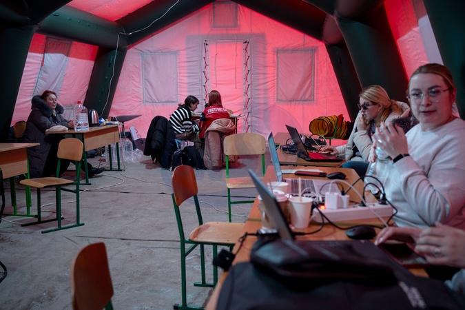 People charge their mobile phones and laptops at a mobile heating point of the State Emergency Service of Ukraine deployed in the Kharkivskyi residential area amid power and heating disruptions following Russian attacks on Ukraine's energy facilities, Kyiv, Ukraine, on January 21, 2026, Credit:Danylo Antoniuk / Avalon