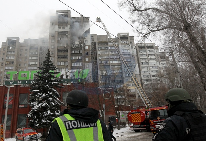A rescuer extinguishes a fire from a ladder truck at a 16-storey residential building hit by a Russian drone in Dnipro, Ukraine, on January 22, 2026, Credit:Mykola Miakshykov / Avalon