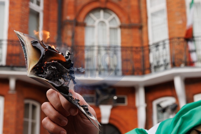 Protester burns Iranian passport, Iranian Consulate, London, UK.