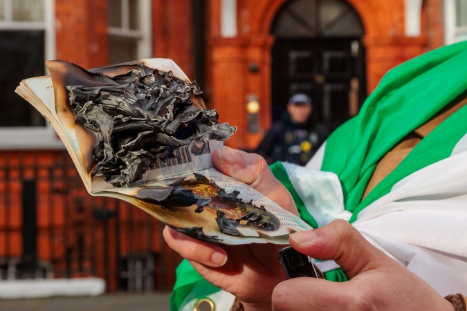 Protester burns Iranian passport, Iranian Consulate, London, UK.