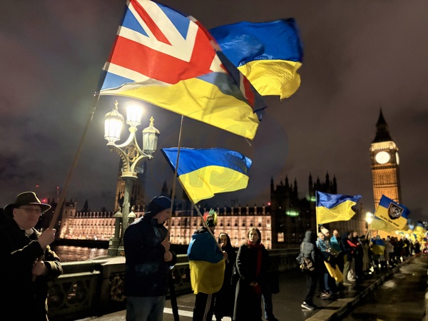London, UK. 22 January 2026. Ukrainians and supporters form a human chain on Westminster Bridge during a Unity Day (Sobornist) rally, marking the anniversary of Ukraine's national unity. The demonstration, organised by pro-Ukraine groups, highlights solidarity with Ukraine and calls for continued international support amid the ongoing war., Credit:Alexander Seale / Avalon